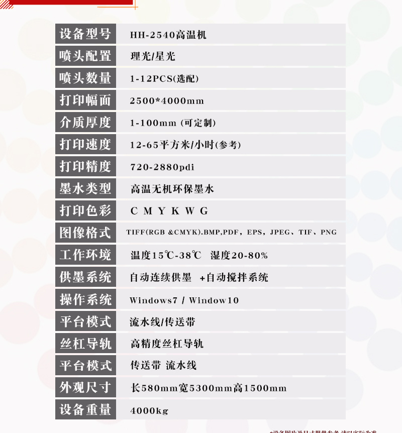 打印介质 | 玻璃/陶瓷/岩板/瓷砖/大理石/面板/微晶石/岗石/花纸/人造石等 | ||