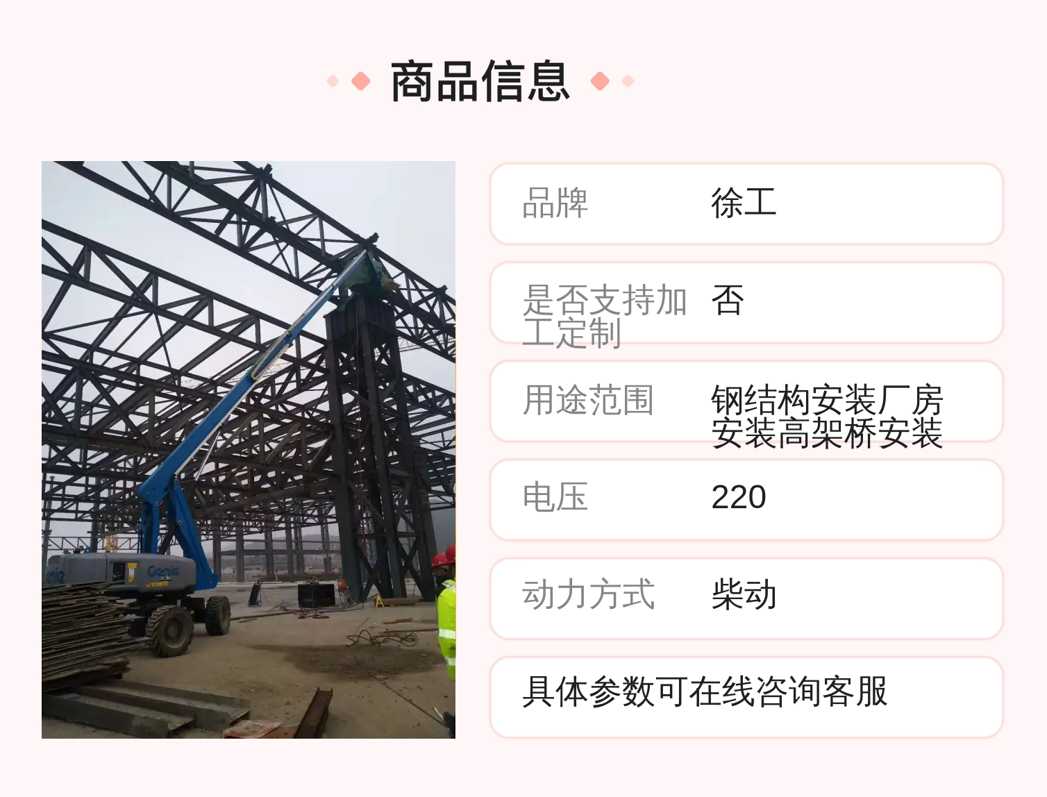 用途 | 钢结构安装、厂房安装、高架桥安装等 | ||