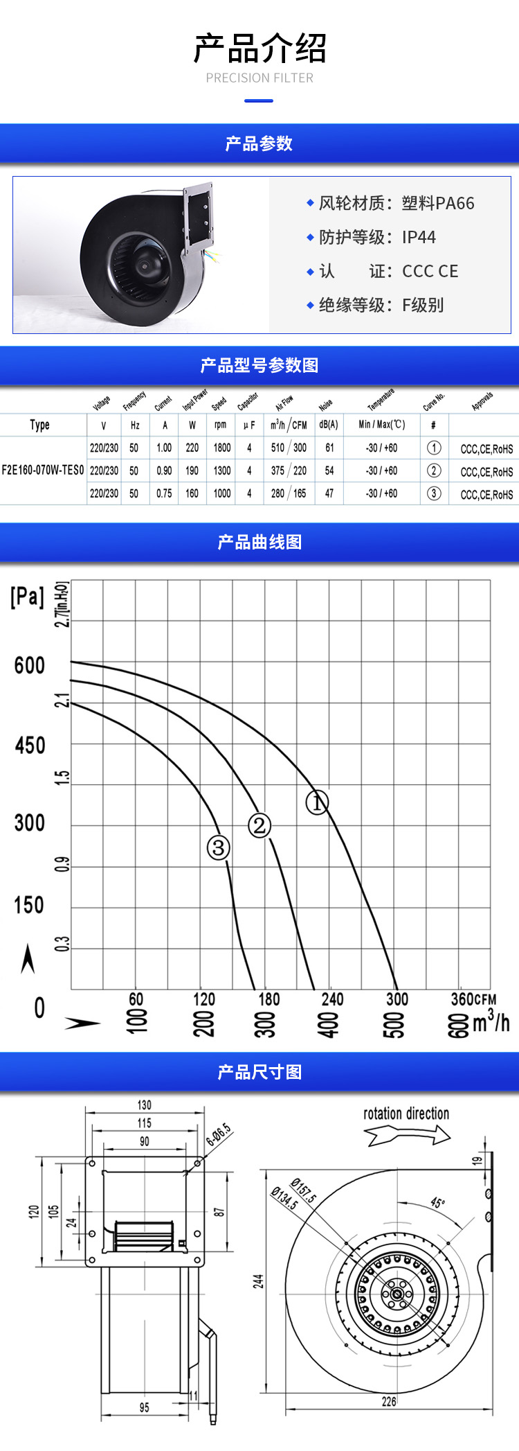 三速直径160mm外转子AC交流单进风蜗壳离心风机通风散热用鼓风机