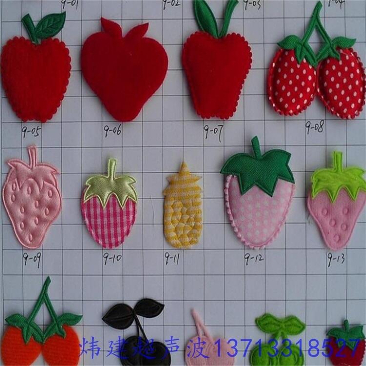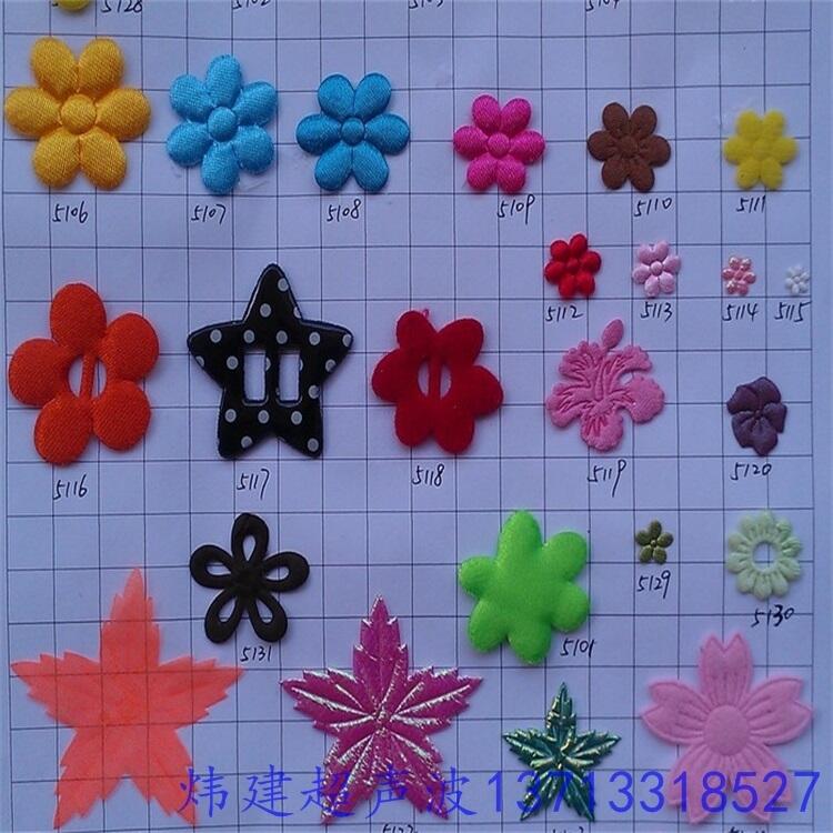 东莞市寮步炜建超声波机械厂承接各种超声波压花、布料,织带超声波花边加工,其超声波制品适用于服装、鞋帽、箱包、玩具、头饰等装饰,可也用于纸卡、贺卡等纸制品和礼品包装装饰,以及儿童早教益智用品装饰或DIY配件,尺寸从3mm~80mm 不等,形状不一,款式多样,产品主要包括: