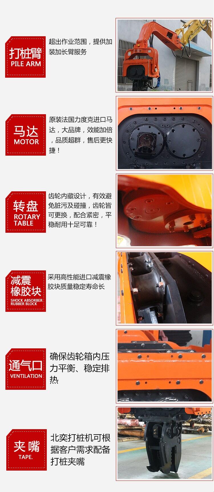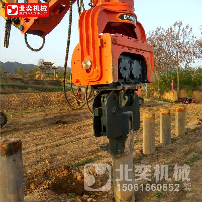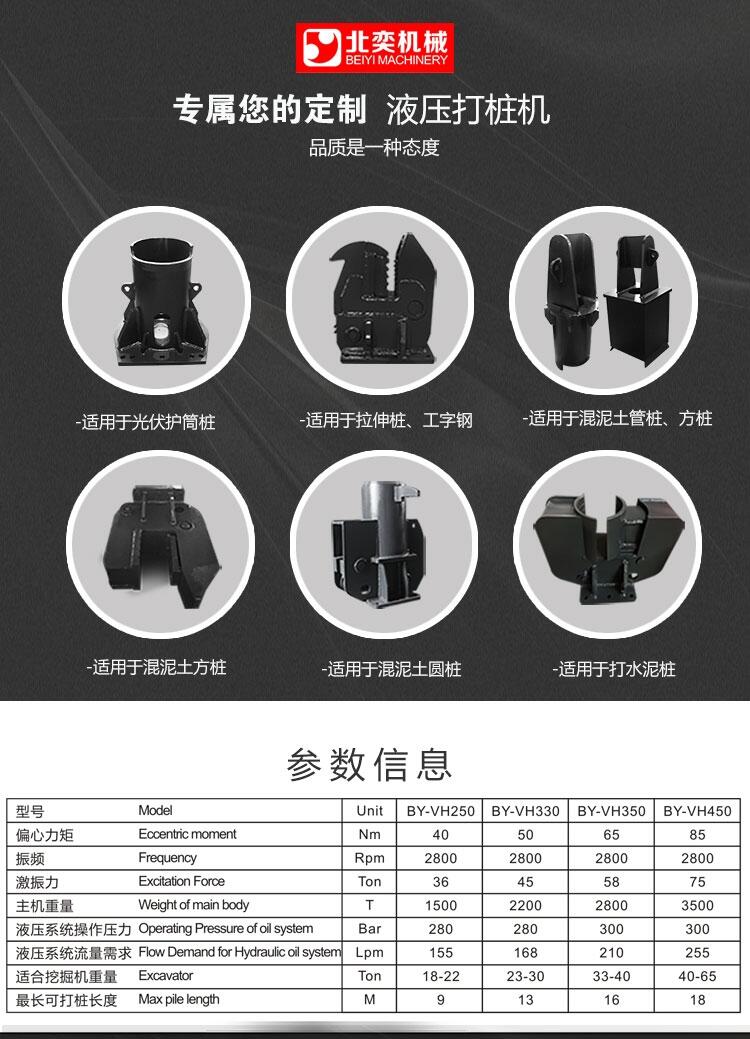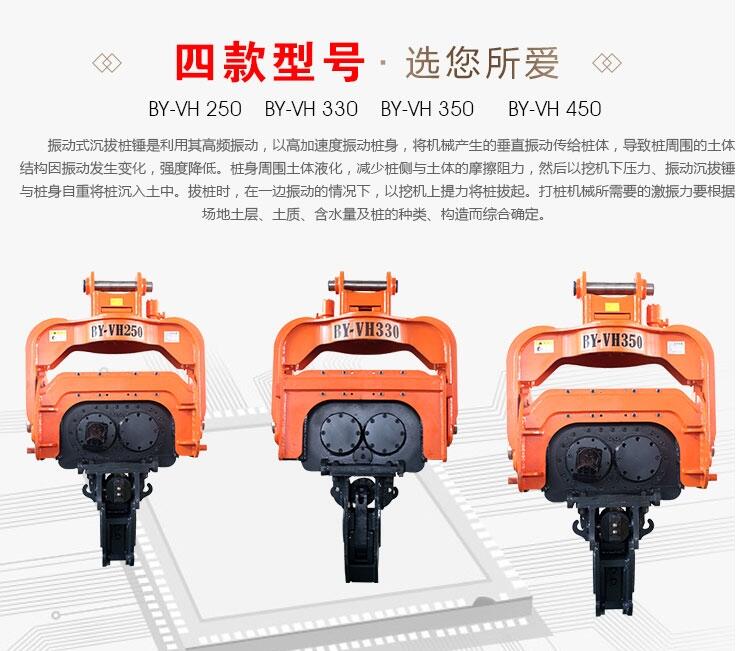 还可以建造薄壁防渗墙,深层密实处理,地面夯实处理等特殊施工。工作时振感小,噪声低,没有污染:高频液压振动锤,另配降噪动力箱,在城区施工时完全可满足环保要求。作业适用范围广:适于打任何形状、任何材质的桩,如钢管桩、混凝土管桩;管经可达800-2000mm。适用于任何土层;可用于打桩、拔桩和水下打桩;可进行桩架作业和悬挂作业。高频液压振动打桩机,是运用振动式沉桩打拔桩,特别适用于市政、桥梁、围堰、建筑地基等中短桩工程。高频液压振动打桩机内置两只偏心轴,采液压马达驱动,产生高速旋转及垂直激振力,透过减振橡胶块后,维持一定的振幅,能够应付各种类型的土质与打桩要求。激振力是与偏心轴尺寸和振动次数平方成正比。