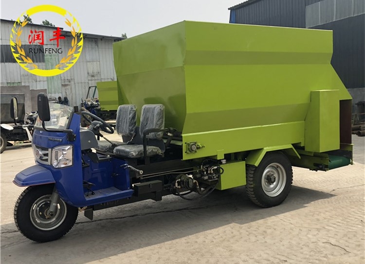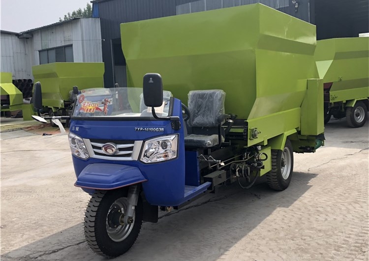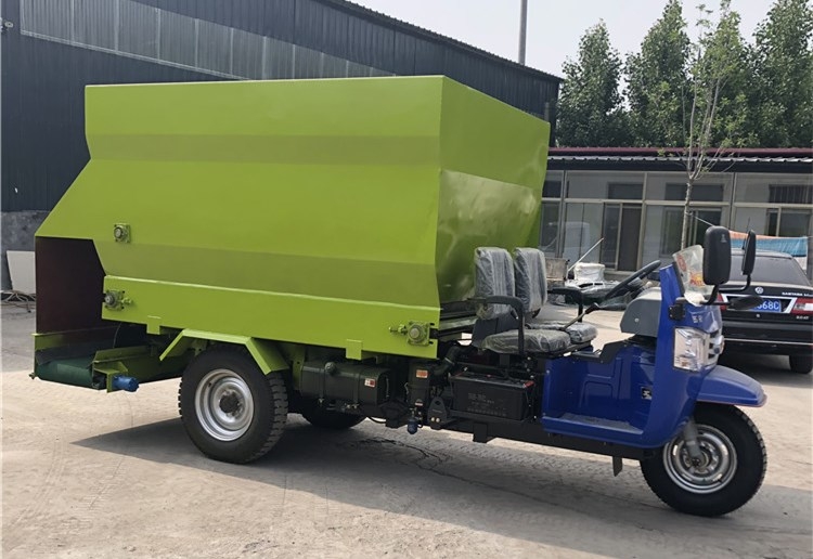 撒料车的主要功能是将成品日粮直接抛撒在饲喂区域内一次性完成饲喂,广泛用于农牧业养殖区,大中型饲养场和规范社区饲养场的饲喂作业,可将各种牧草,农作物秸秆,青贮饲料等纤维性饲料混合搅拌均匀后,投入本车内,进行投喂作业。使用简单方便,易于操作,产品质量,经久,撒料过程中可根据用户的圈宿牲畜的密度调节饲喂料,使用效率高,省时省力,节省养殖场空间。采用本车饲喂全混合日粮,能够使碳水化合物.脂肪.纤维素等营养物质在瘤胃中被同时利用,瘤胃维生素的繁殖速度和菌体蛋白的产量都能大幅度提高。简化饲喂程序,减少饲养的随意性,使管理的程度大大提高;实行分群管理,便与机械饲喂,提高劳动生产率,降低劳动率成本。电动撒料车主要结构:该机由电动三轮车和撒料系统两部分组成,电动三轮车主要从事运输行走及撒料动力,撒料系统是通过主输送和小输送带动完成投喂。