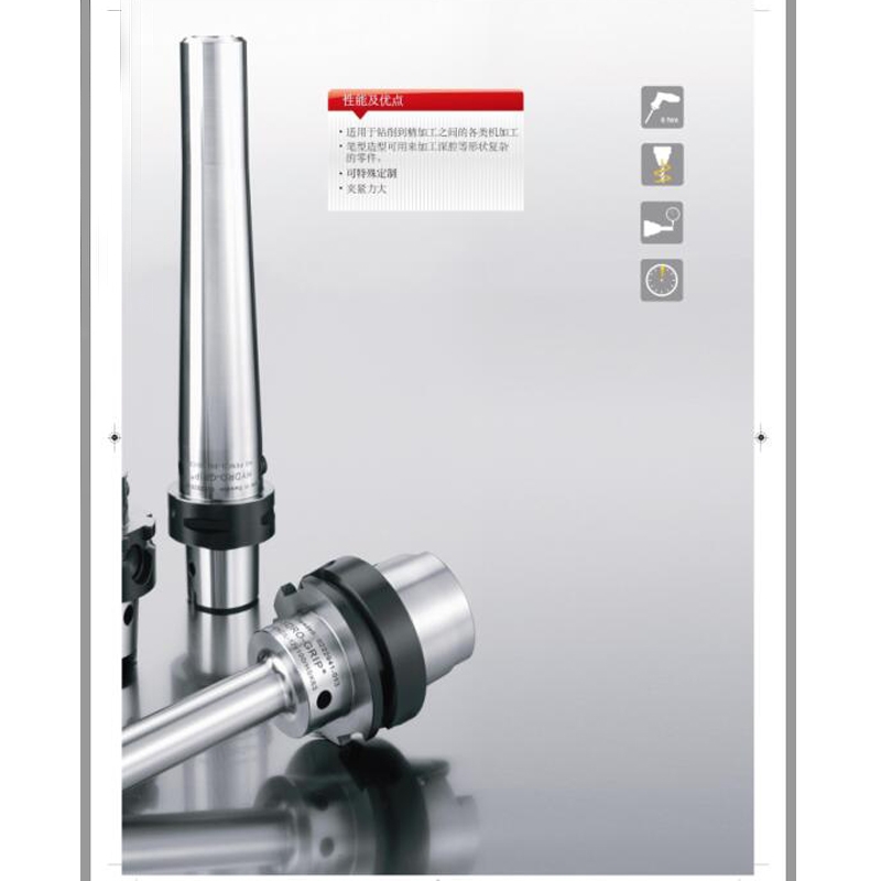 精度:悬伸为刀具直径2.5倍处所测得的径向跳动<0.004(最大悬伸:50mm),当刀柄的基准长度L1>125mm时,悬伸为刀具直径2.5倍处所测得的径向跳动量<0.007