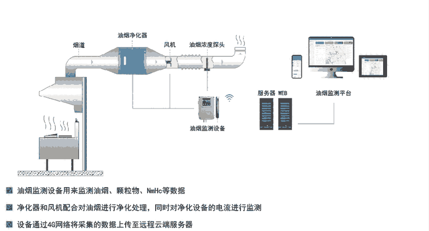 对油烟排污数据的监测,包括油烟排放浓度,颗粒物,NmHc等数值采集监测;同时对监控风机和净化器的启停状态、运行数据进行监测。