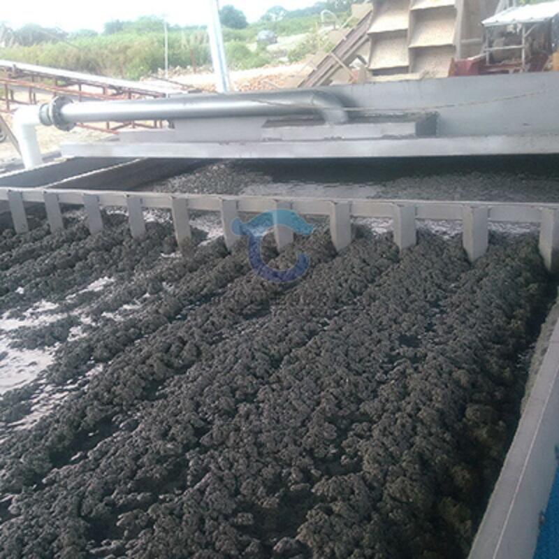 经絮凝的污泥首先进入重力脱水区,大部分游离水在重力作用下通过滤带被滤除;随着滤带的运行,污泥进入由两条滤带组成的楔形区,两条滤带对污泥实施缓慢加压,污泥逐渐增稠,流动性降低,过渡到压榨区;在压榨区,污泥受到递增的挤压力和两条滤带上下位置交替变化所产生的剪切力的作用,大部分残存于污泥中的游离水和间隙水被滤除,污泥成为含水率较低的片状滤饼;上下滤带经卸料辊分离,凭借滤带曲率的变化并利用刮刀将滤饼刮落,实现物料的固液分离,而上、下滤带经冲洗后重新使用,进行下一周期的浓缩压滤。