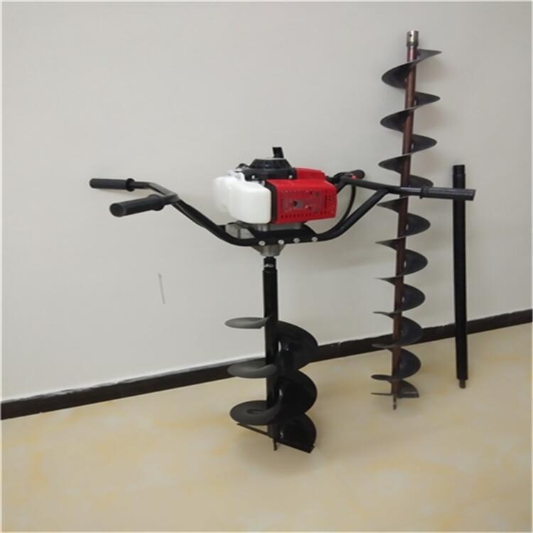 便携式植树挖坑机,由单缸风冷二冲程汽油机,减速器,操作手把总成和螺旋升土翼片钻头构成.其设计主要是仅用一个卡箍锁圈便将汽油机,减速器连接在一起,简单牢固,维修方便;减速器结构紧凑,一级减速传动比大,承载能力高,传动功率大,扭矩高,钻头转速合理,装卸方便,钻头镶焊有合金,延长寿命,持久耐用;双人操作手把有二级减震,还能折叠,使体积缩小2/3,并能随时更换为单人操作小手把挖小坑,便于运输,携带;挖坑直径10~50cm,深度50~100cm,效率1坑/分钟.另外,本机还可在建筑,地质,矿山,电力,门用于埋设桩,柱,杆,打眼,勘探等作业.