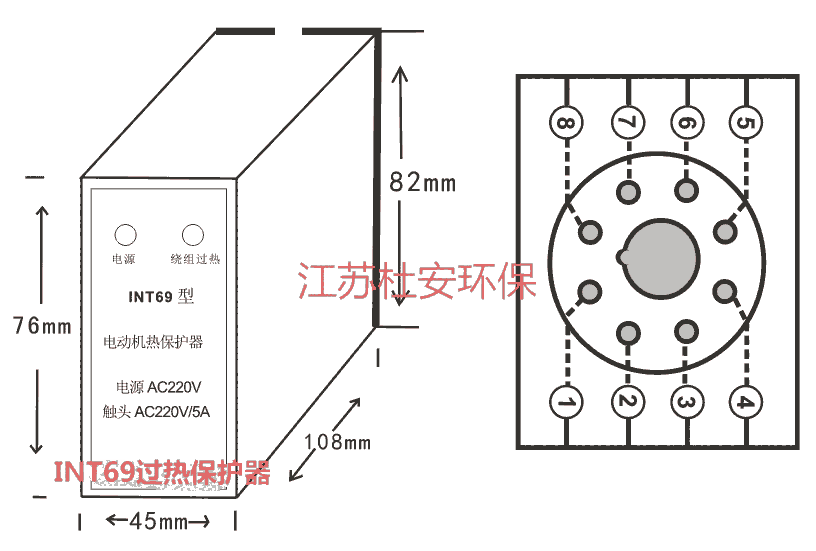 江苏杜安环保INT69型电机过热保护器接到控制系统中,能有效的保护电机在运行时由于各种原因,所造成绕组线圈温度升高到一定值能及时停止工作的功能。当检测到潜水泵定子绕组线圈温度到该继电器设定值时,继电器面板上红色指示灯会报警亮起,且过热继电器的5、6和7、8端子会有一个开关量输出,来控制泵的停止;当温度下降后继电器继续恢复工作。