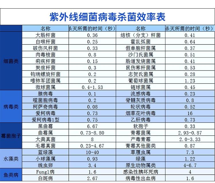 2.高效杀菌广谱性:紫外线杀菌的广谱性是最高的,它对几乎所有的细菌、病毒都能高效率杀灭。