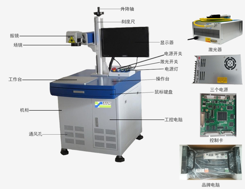 M20 mopa激光打标机结构与大功率光纤激光打标机相同,如下图:有升降轴、刻度尺、振镜、 场镜、显示器、工作台、鼠标键盘、工控电脑、机柜、电源灯、电源开关、三个电源、激光器、 红光、控制盒、自动升降控制器、控制板等。