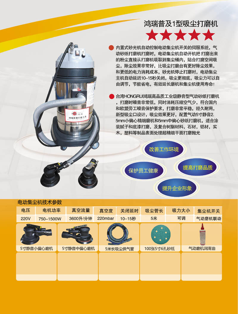 5、台湾鸿瑞专业的高品质工业级5寸气动低耗气静音砂纸打磨抛光机,打磨耗气小、打磨噪音低,符合国内和欧盟打磨噪音要求。打磨机经久耐用,打磨平稳不发抖,确保打磨平面精度和长时间使用不疲劳。