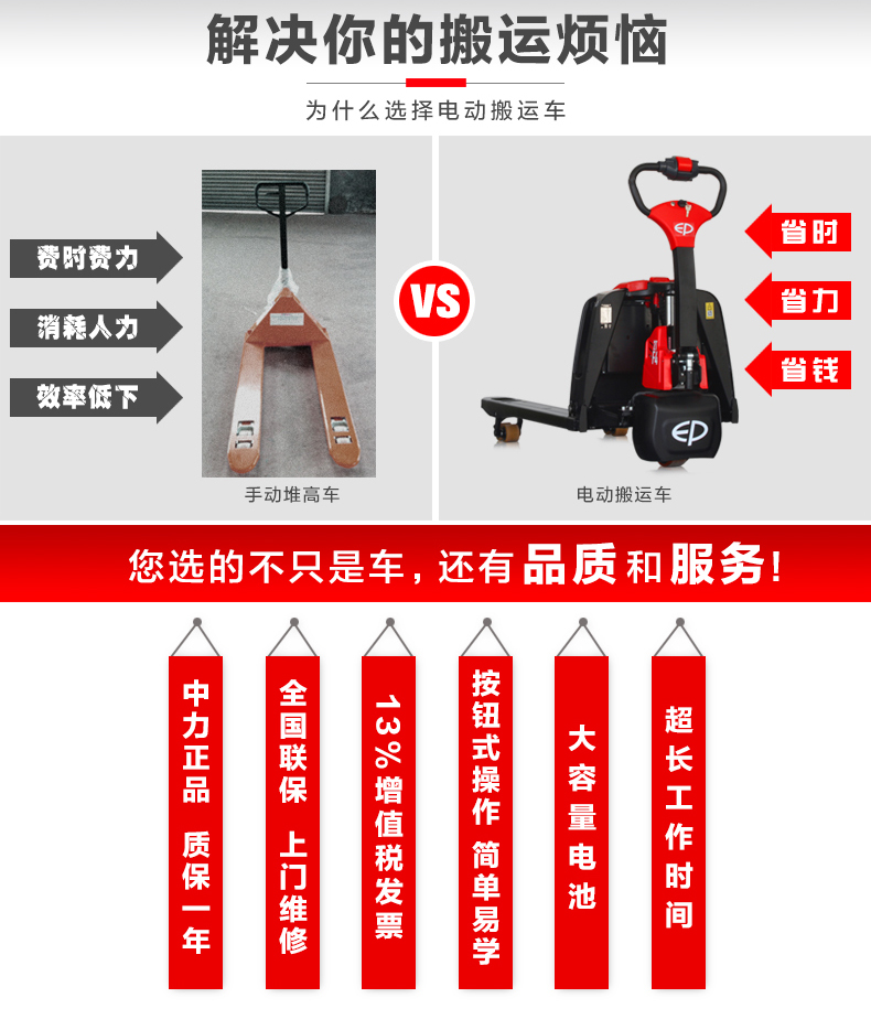 关于产品 本公司所售电动叉车是根据要求定做,为定制型产品,客户需向客服提供实际载重量、升降高度、使用环境、托盘类型、叉车使用时间等,我们将以此协助您选型,并通过邮件或旺旺发送所需产品的图片、配置清单,对产品实图、配置、价格以及付款方式同意后,双方签订合同。本店所展示产品图片与实物存在一定偏差,下单前请与客服确认产品实际款型。