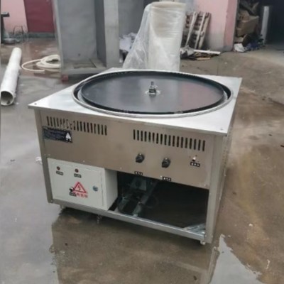 该机采用电子自动打火装置,内有12mm厚的铸铁平底锅,下面有外露液化气管接头,接头连上管后,启动电子打火即可点然,内部装有可调速电机,外侧面有调速开关,可以控制平底锅的转速。使用前往平底锅上擦油,以确保煎出的锅贴色泽金黄,外焦内软。
