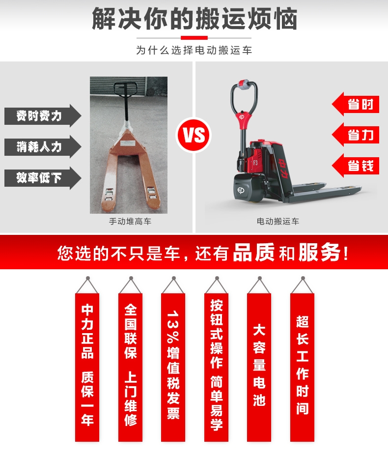 关于产品 本公司所售电动叉车是根据要求定做,为定制型产品,客户需向客服提供实际载重量、升降高度、使用环境、托盘类型、叉车使用时间等,我们将以此协助您选型,并通过邮件或旺旺发送所需产品的图片、配置清单,对产品实图、配置、价格以及付款方式同意后,双方签订合同。本店所展示产品图片与实物存在一定偏差,下单前请与客服确认产品实际款型。