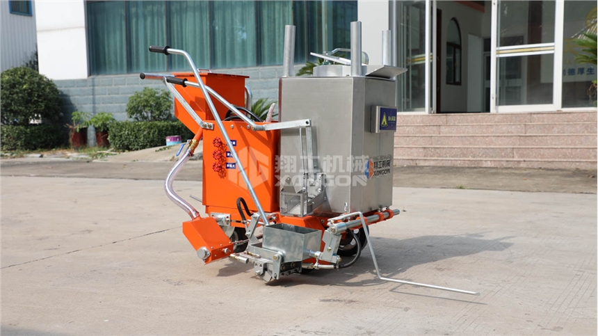 常规的划线料是通过热熔釜加热融料,但是小型工程使用热熔釜就会面对投资大,体积大等问题,根据市场需求,我们公司研发了一款加强型的热熔标线机。