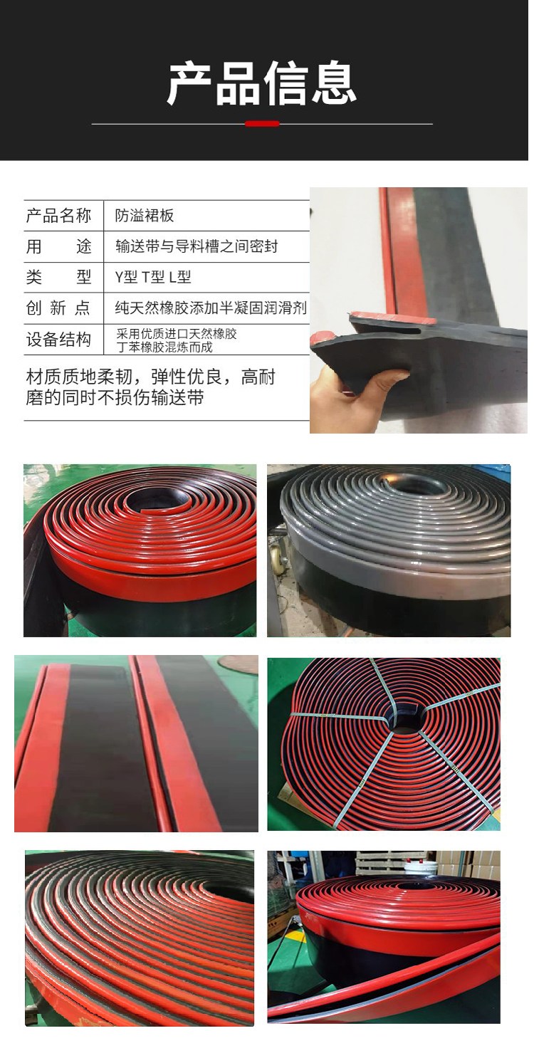 适用--特别适用于电厂、煤矿、水泥厂、港口、钢厂、焦化厂等各种输送设备,以防止物料在运输过程中的外溢。此外,防溢裙板在建筑、工程、机械制造、船舶等行业中得到广泛使用。