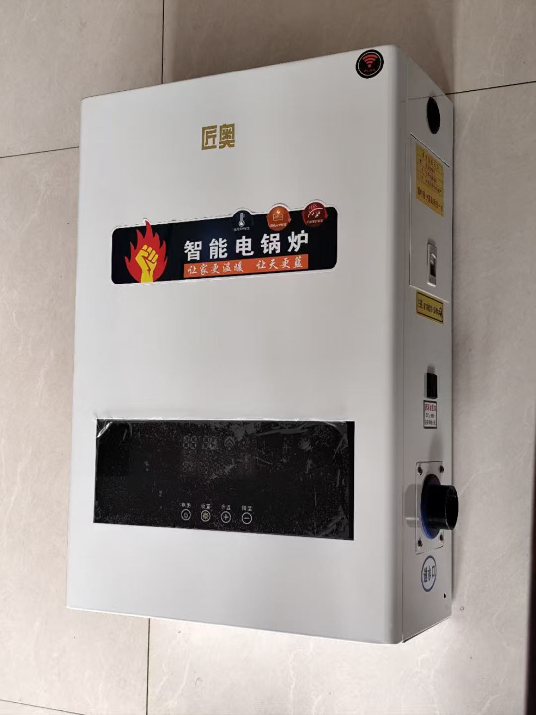 1、该款匠奥电采暖炉采用壁挂式结构,智能控制器三档位调节,智能控制停止加热温度,启动加热温度,水泵运转温度,定时等;