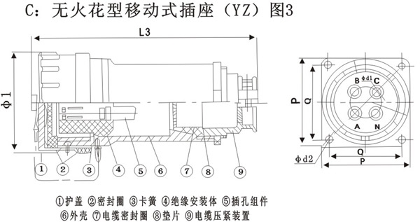 15A-300A YT/GZ/YZ无火花型播送插头插座系列产品应用在野外移动电站与缆及负载之间的电气连接。广泛使用在石油、化工、国防电力和交通运输等领域。插头、插座采用铝合金外壳,电接触件表面镀银和导线端接方式为压接。具有插拔快捷,接线方便,电接触可靠,良好的密封性和绝缘性,防水防尘抗冲防震、使用寿命长的特点。其符合BG3936.8-2003《爆炸性气体环境用电气设备第8部分“n”型电气设备》标准。该系列产品经国家指定的防爆电气产品质量监督检验测度中心检验合格防爆标志为:ExnA11T4,取得防爆合格证和生产许可证。