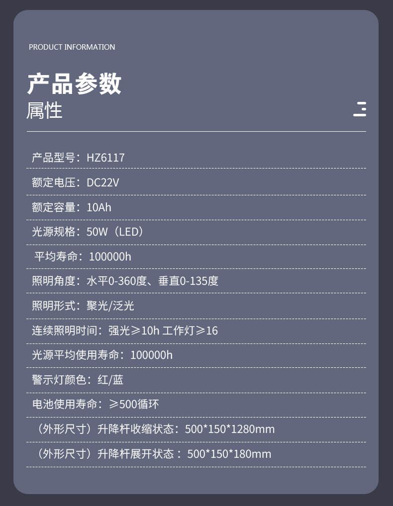 4.长时间,强光放电时间>10h,工作光放电时间>16h,满足夜间长时间施工照明。
