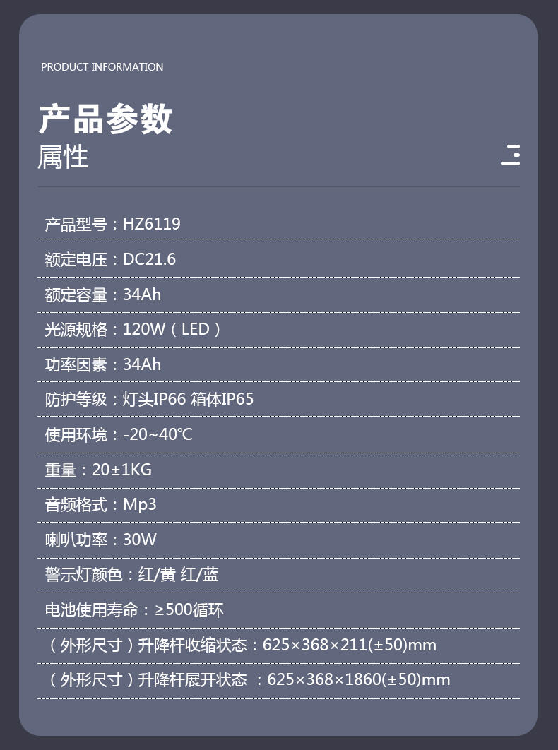 灯具采用大容量高能锂电池,照明功率120W,可满足客户施工现场大范围照明需求;