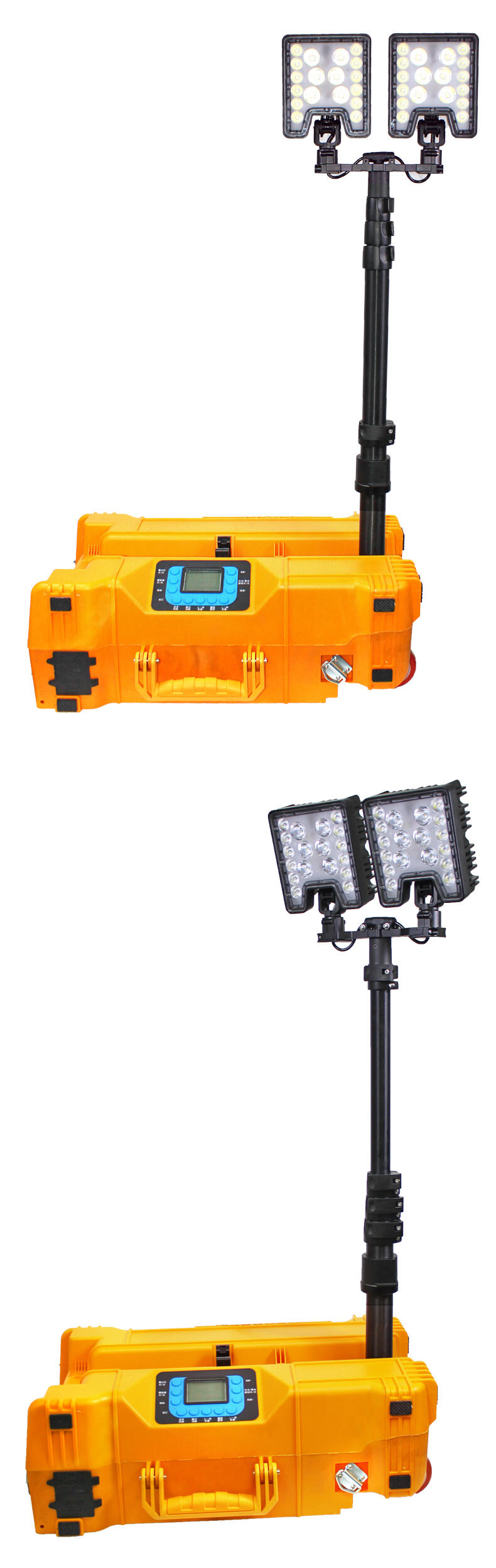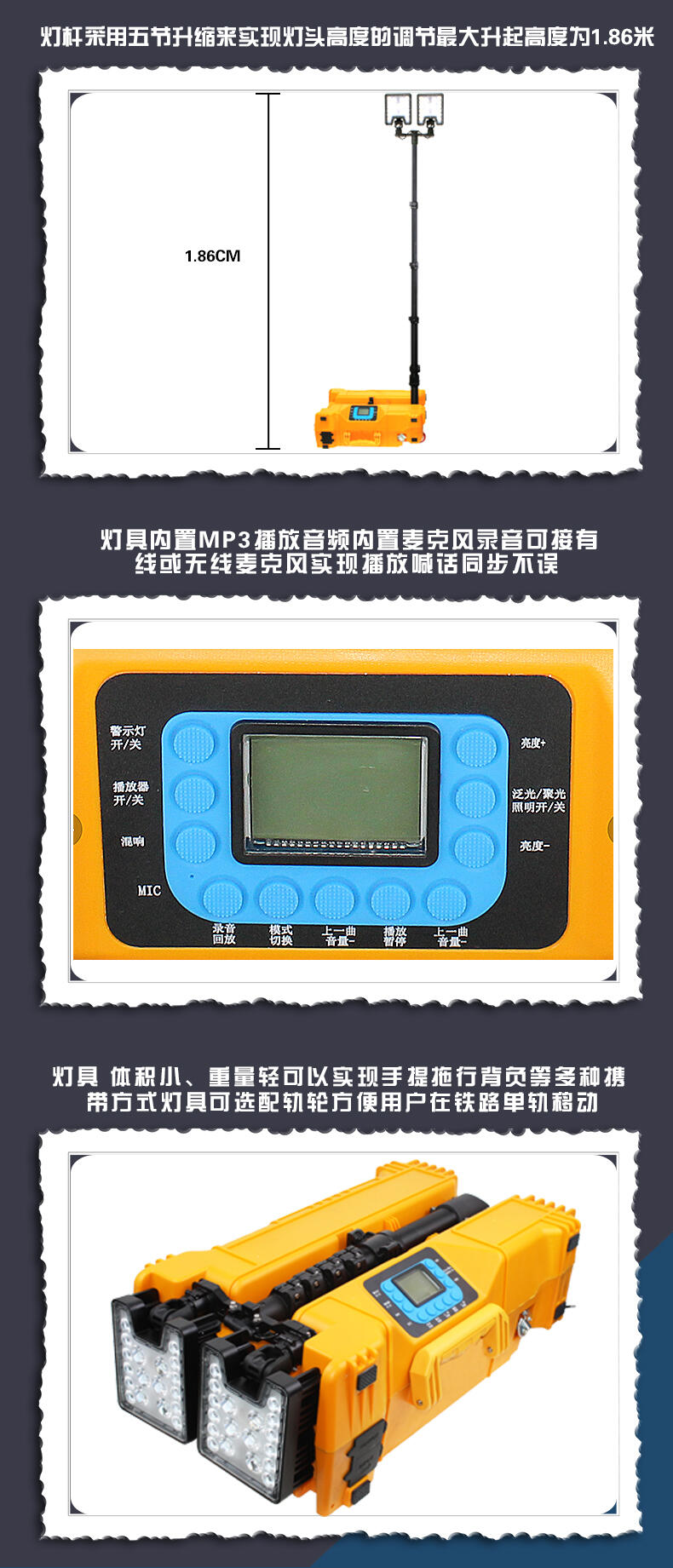 灯杆采用五节升缩来实现灯头高度的调节,最大升起高度为1.86米;