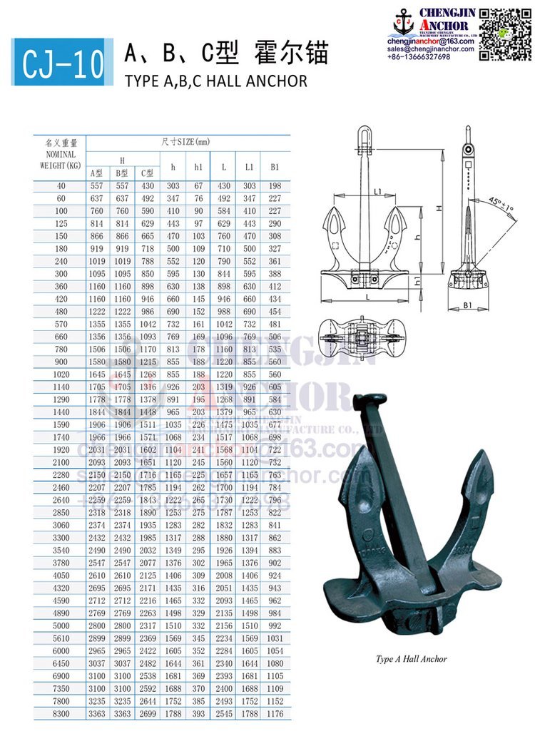 滕州成金船锚 生产斯贝克锚,霍尔锚,海-军锚,日本无杆锚,CJD-14 德尔塔大抓力锚(三角锚),CJT-20 (TW波尔)大抓力锚,CJ-17大抓力锚(MK5海工锚),丹福尔锚,我公司可提供ABS, BV, CCS, DNV, NK, GL, LR, RMRS, KR, 等普通锚船检证及大爪力锚船检证,欢迎订购!!