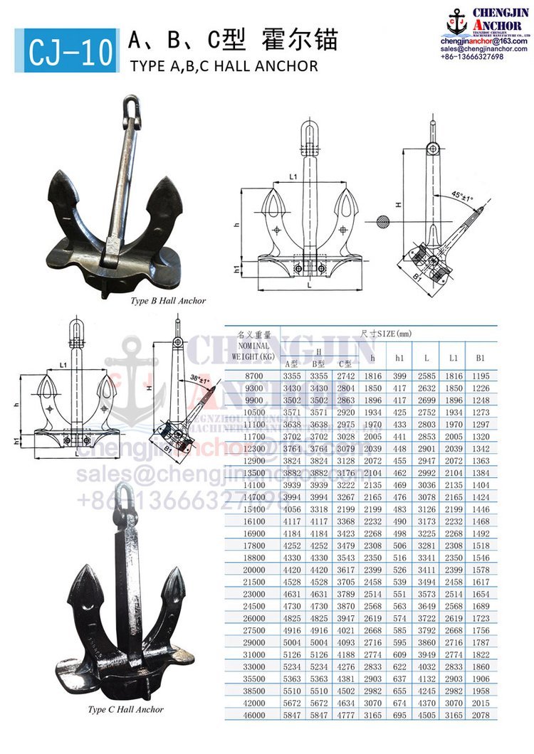 滕州成金船锚 生产斯贝克锚,霍尔锚,海-军锚,日本无杆锚,CJD-14 德尔塔大抓力锚(三角锚),CJT-20 (TW波尔)大抓力锚,CJ-17大抓力锚(MK5海工锚),丹福尔锚,我公司可提供ABS, BV, CCS, DNV, NK, GL, LR, RMRS, KR, 等普通锚船检证及大爪力锚船检证,欢迎订购!!