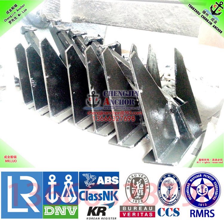 滕州成金船锚 生产斯贝克锚,霍尔锚,海-军锚,日本无杆锚,CJD-14 德尔塔大抓力锚(三角锚),CJT-20 (TW波尔)大抓力锚,CJ-17大抓力锚(MK5海工锚),丹福尔锚,我公司可提供ABS, BV, CCS, DNV, NK, GL, LR, RMRS, KR, 等普通锚船检证及大爪力锚船检证,欢迎订购!!