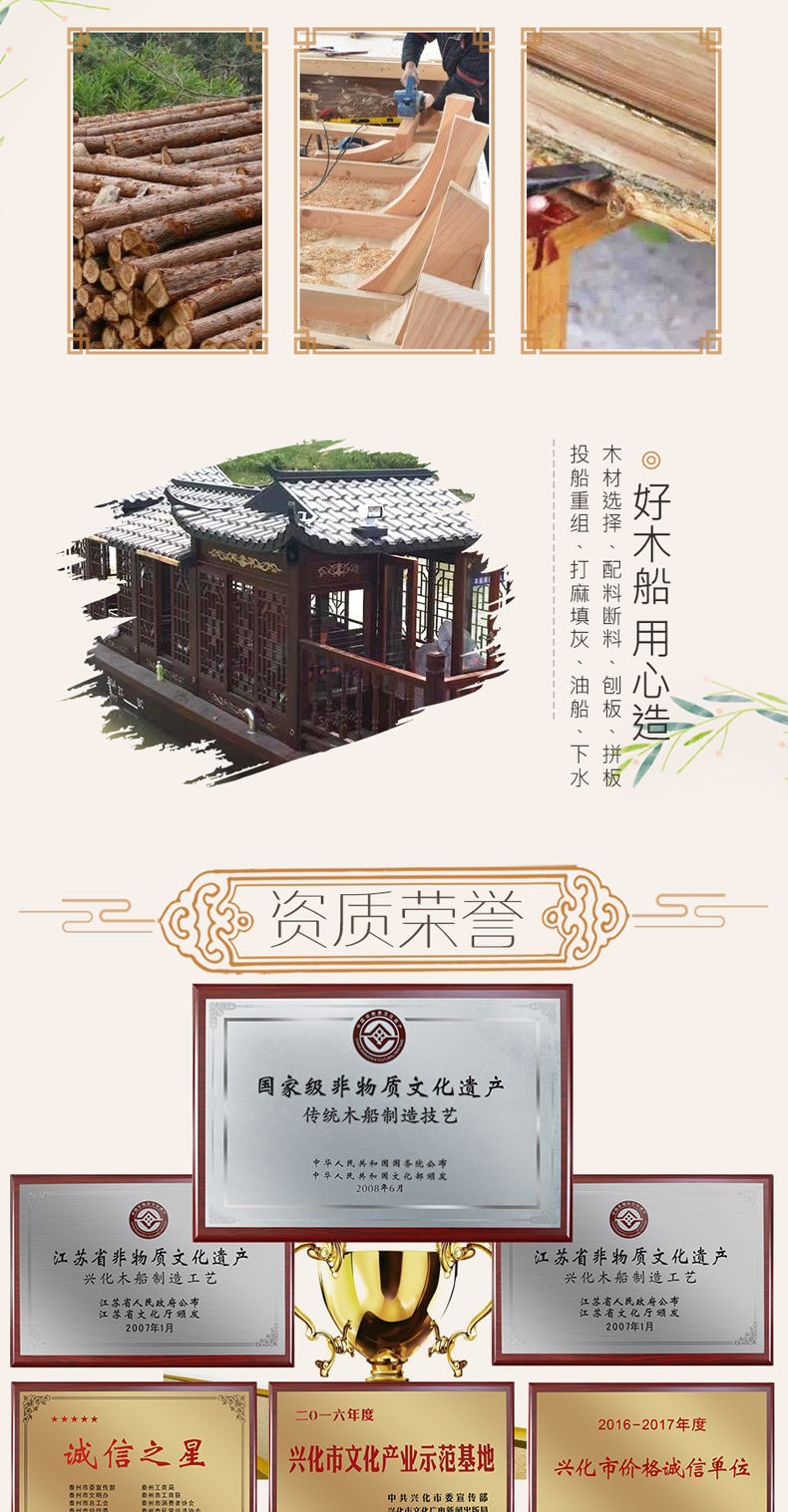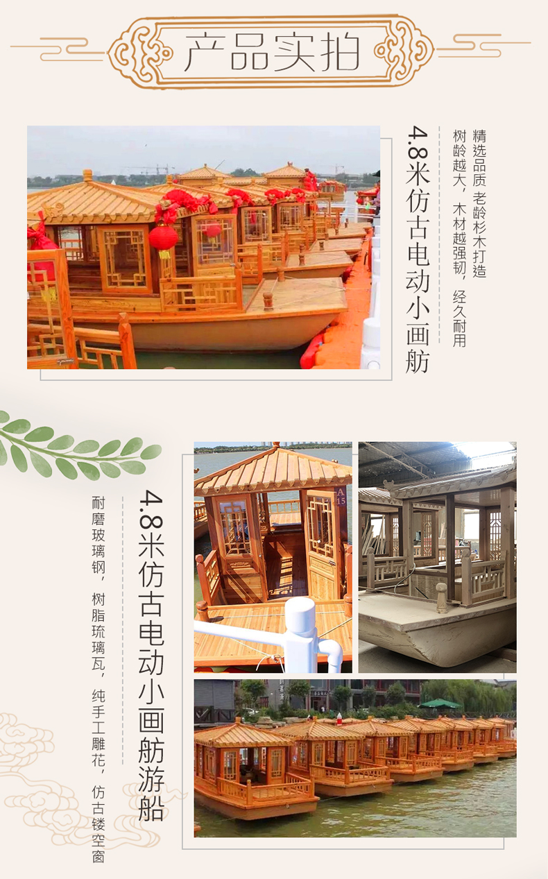 小型中式景区电动仿古实木质玻璃钢船观光旅游餐饮画舫船