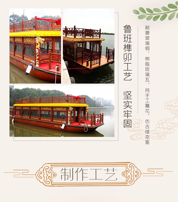 周氏仿古电动游船双层画舫船木质旅游观光船大型木船厂家可定制