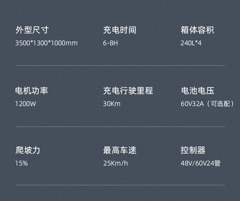 灯光及信号 | LED照明灯、左右转向灯、刹车灯、行车灯、仪表、电喇叭、工作警示灯 | ||