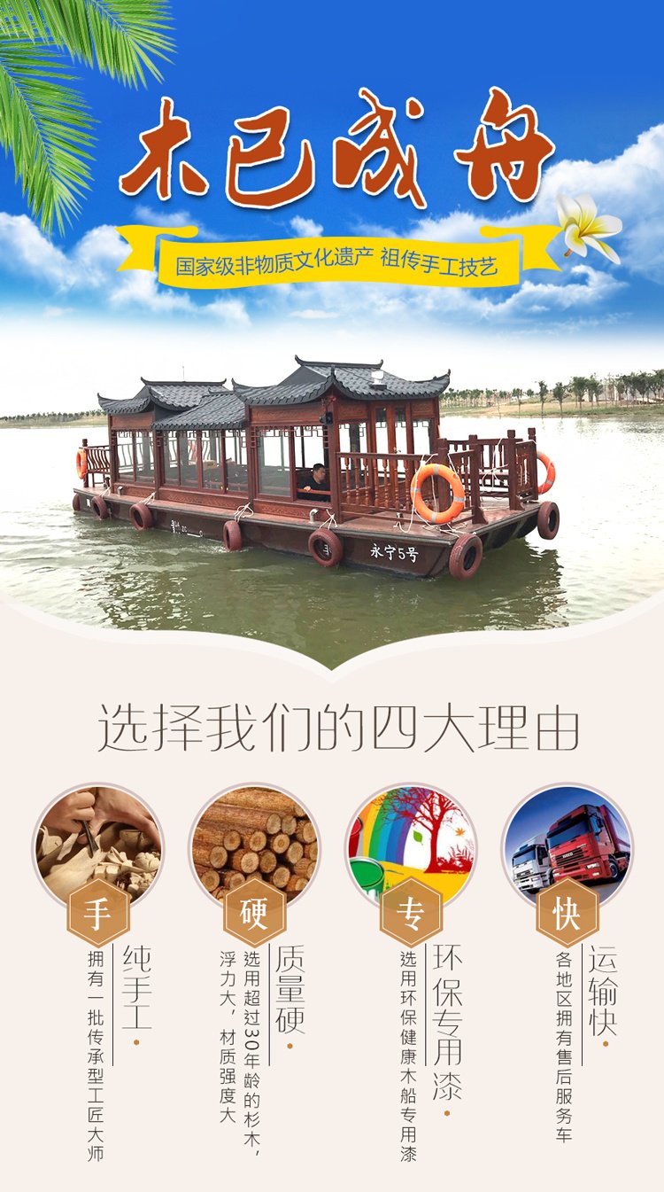 木已成舟牌10米玻璃钢电动画舫游船22人24游客木质画舫船大型游船厂家定制