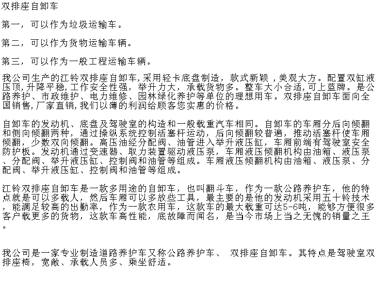 我们公司生产的江铃牌双排座自卸车,底盘采用江铃原厂生产的底盘,原厂研发的五十铃牌发动机,动力强劲,油耗低、噪音小,外观时尚,乘坐舒服,比普通的车型寿命还能高个2-3年,并且以后不需要的时候,当二手车也比较好卖。