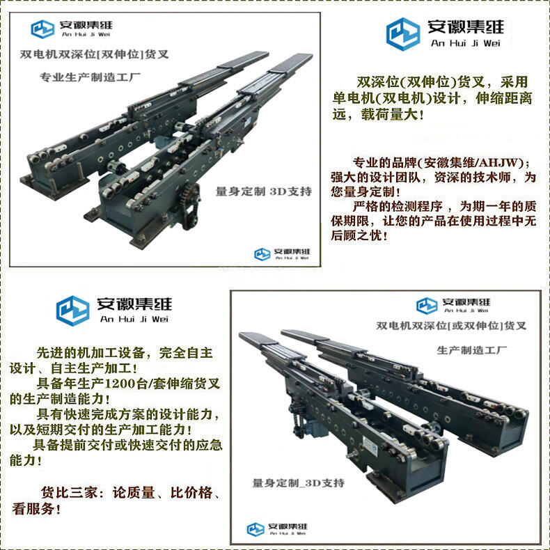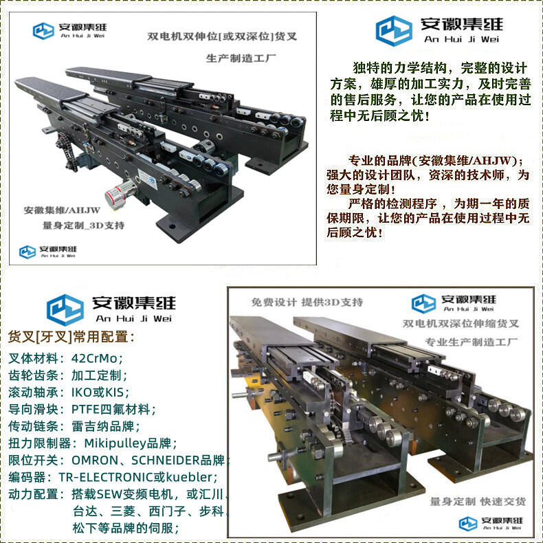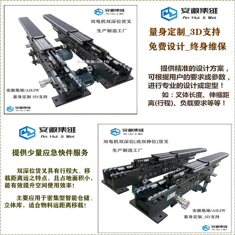 双深位伸缩牙叉在动力方面,既可以采用单电机驱动,也可以采用双电机驱动!在负载量不是特别大、行程(伸缩距离)也不是特别远的情况下,可以采用单电机驱动,反之就采用双电机驱动比较合适!