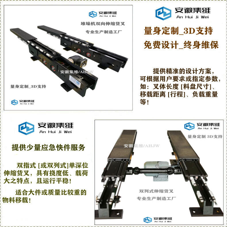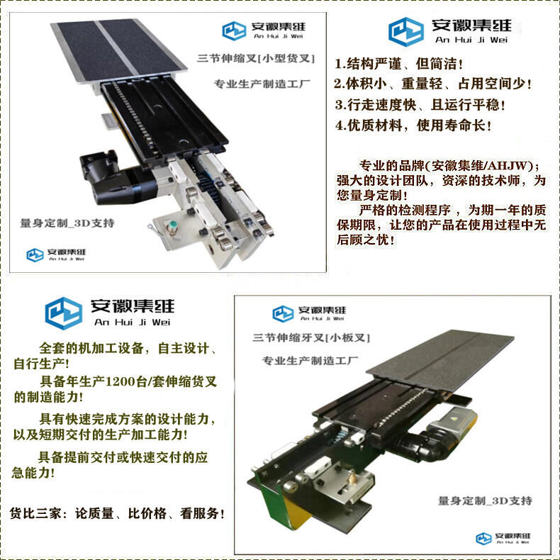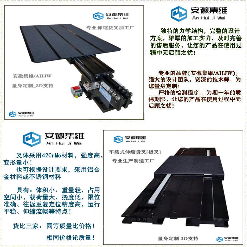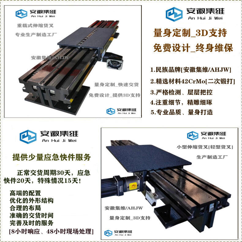 安徽集维智能装备有限公司[马鞍山市]是一家集研发、生产、销售为一体的伸缩货叉生产制造厂家,拥有完整的质量管理体系、多位资历深厚的工程设计师和经验丰富的技术团队,全套的机加工设备,自主设计、自主生产,具备年生产1600多台套伸缩货叉的制造能力,具有快速完成方案的设计能力,以及短期交付的生产加工能力,具备提前交付或快速交付的应急能力!
