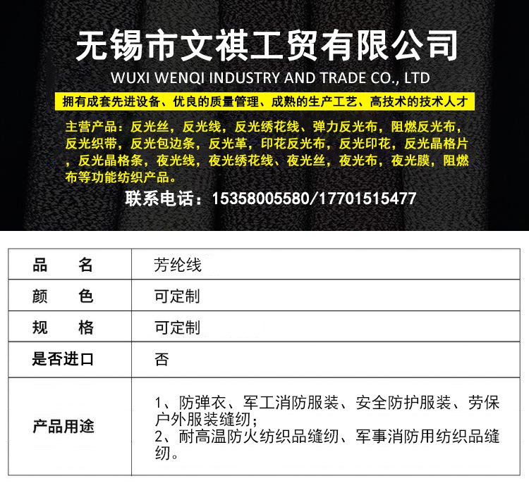 适用范围:防火、耐切割手套、过滤袋、防护服装、帐篷、特种工装的缝制等需要阻燃的产品