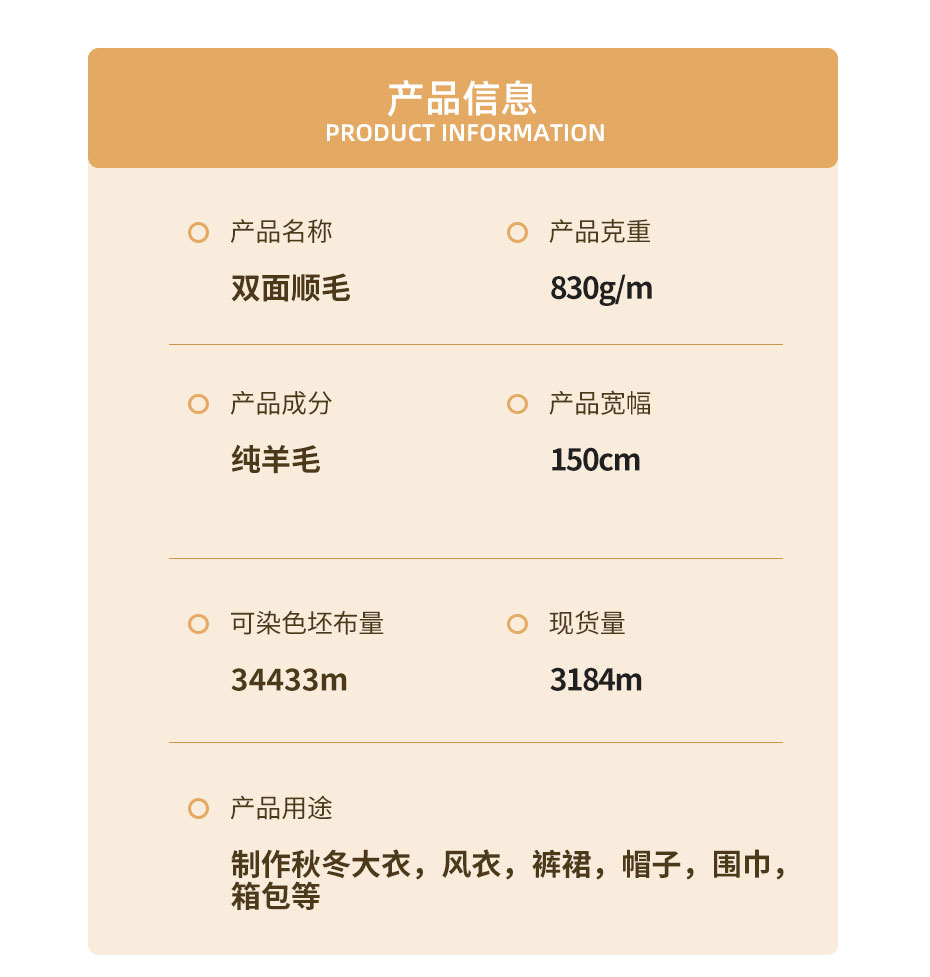 具体用途制作秋冬大衣、风衣、裤裙、帽子、围巾、箱包等