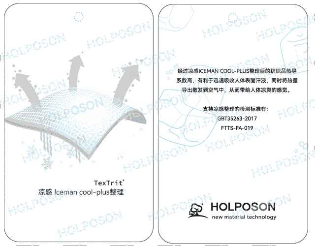HOLPOSON® Iceman COOL-PLUS 是本公司以超细云母粉为主,并运用萃取技术,经科学精心开发研制的纺织品用后整理剂。它能提高织物的热导系数,迅速吸收人体表面汗液,同时将热量导出散发到空气中,从而带给人体凉爽的感觉。本产品还具有一定的防紫外线效果。主要适用于内衣面料、衬衫面料、床上用品面料、登山服、高尔夫服装、休闲系列服装面料、各种服饰面料、家用纺织品面料等。