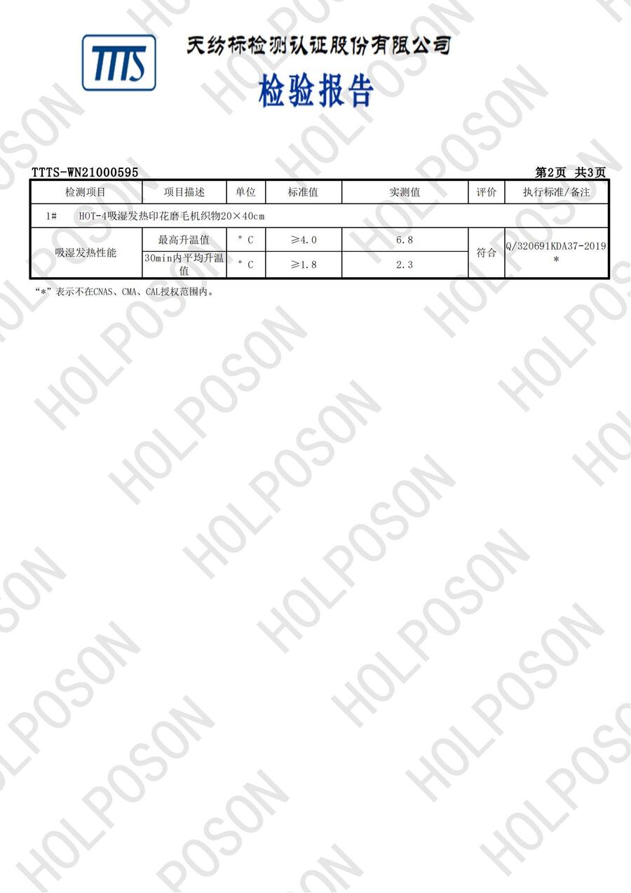 HOLPOSON® HOT 适合用于棉,粘胶,涤纶,晴纶等各种纤维的后整理。其作用原理 HOLPOSON® HOT 是处理在面料上,使面料周围的水蒸气或者汗蒸汽凝聚成水珠或者汗珠所产出的凝聚热,让人体感受到暖感,从而达到蓄热保暖的功能。