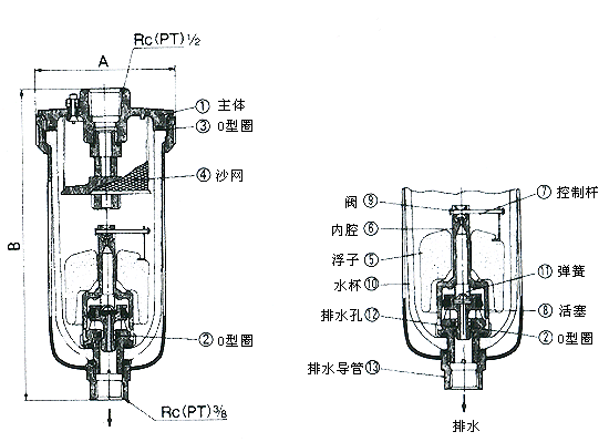 当压力在正常情况下0.1MPa以上时,活塞⑧克服弹簧⑾向上压,因而排水道⑿关闭,水杯⑩内部与外界隔断。