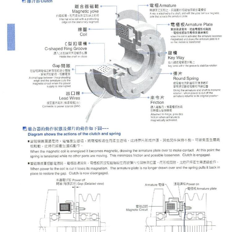 当磁场线圈通电时,电枢产生磁场,将电枢板吸住而产生连结,此时弹片形成伸张,其他另件保持不动,可避免产生磨耗或松动,此时已经产生连结动作。