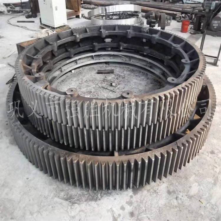 巩义市强胜机械有限公司生产回转窑大齿轮采用 铸钢材质,回火正火处理,HB硬度170-190,车加工成品,公司自行铸造加工各种规格回转窑大齿轮,配套多家大型回转窑厂家,在回转窑配件生产上有多年的生产经验,特殊规格的回转窑大齿轮可定制加工。另为广大使用回转窑(旋窑)厂家提供回转窑大齿轮、回转窑轮带(滚圈)、回转窑托轮、回转窑挡轮等配件。