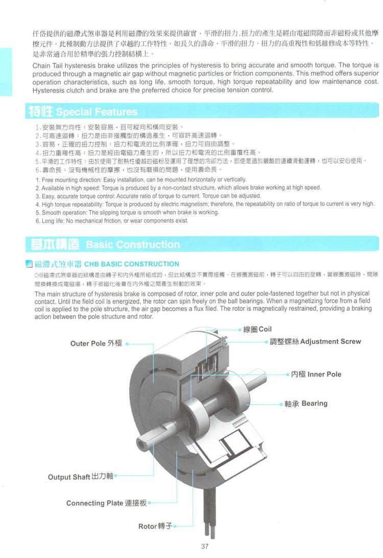 磁滞式刹车器是利用磁滞的效果来提供确实、平滑的扭力,扭力的产生是经由电磁间隙而非磁粉或其他摩擦元件,此种制动方法提供了卓越的工作特性,如长久的寿命,平滑的扭力,扭力的高重复性和低维修成本等特性,是非常适合用于精准的张力控制结构上。