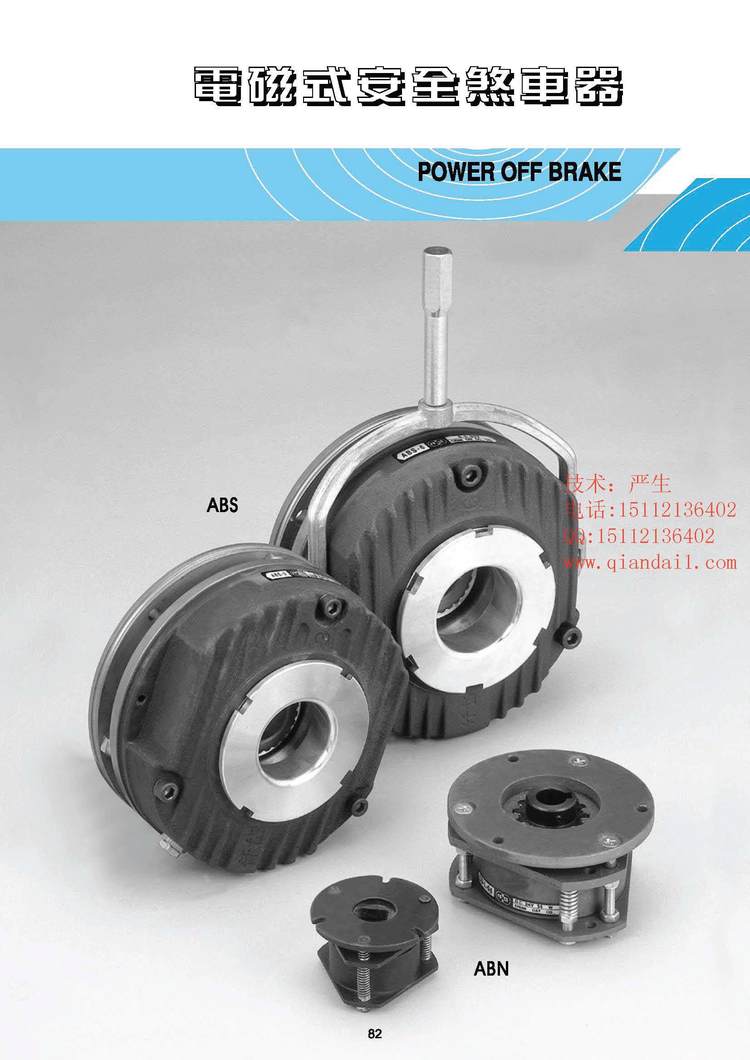 ABS型及ABN型刹车器的别名为(安全刹车器),即使机械正在运转却遇到停电,也可以自行制动,故多应用于自动控制起动机、输送机、升降机、捲扬机、及自动仓库等搬货机械的升降、行走的停止之用。另外也应用于工作机械、特别是多能自动加工机床、之车床等的铣刀桌之传送机构的停止及保持用。