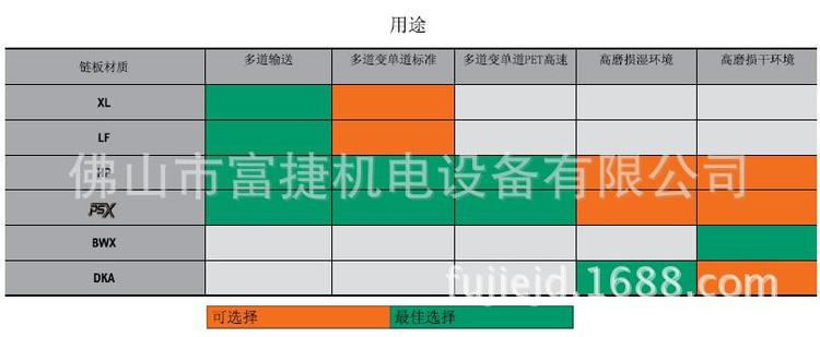 可以选用一系列不同款式的链条应用于货物输送。标准链条(XL、LF、HP)用于一般的箱子、盘子和板条箱的输送。高摩擦性链条(带橡胶垫、顶部带橡胶条)用于爬坡和下坡输送,或用于制动链板上。带滚子的链条(LBP)用于输送物件有堆积的输送机上,以减少产品间的背压力和噪音。这一系列的产品使输送设备得以标准化,从而可以使用相同标准的链轮、轨道、会转轮、回转设计、摩擦条、铰宽以及与不锈钢链(60M75和60S75)配合使用。当塑料模块化输送链网被用于直行输送、则85毫米节距的转弯链是与之配套的理想产品:FGM1050,FT1050及FTM1060适用于1000-和8500-系列,FTM1055和FT1055适用于1005-和7700-系列。即使是在小转弯半径情况下,这些链条也具有一个限度的支撑面积和出色的传送性能。建议再输送要求较高的情况下采用FGM/FTM磁性弯链带,而在普通输送要求的情况下采用FT勾脚型链条。