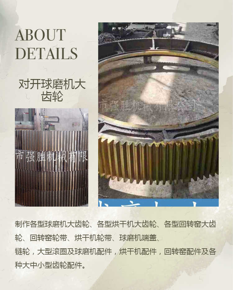 巩义市强胜机械有限公司有直径6.3米双柱立车、直径5米双柱立车、直径4米双柱立车、直径3米双柱 立车,直径6米滚齿机、直 径5米滚齿机、直径4米滚齿机、直径3米滚齿机,大模数小直径滚齿机、八零、六零元车、镗床、铣床、钻 床等设备数十台。制作各型球磨机大齿轮、各型烘干机大齿轮、各型回转窑大齿轮、回转窑轮带、烘干机轮带、球磨机端盖、滚筒烘 干机滚圈、工业大齿圈、 链轮圈,大型滚圈及球磨机配件,烘干机配件,回转窑配件及各种大中小型齿轮配件。
