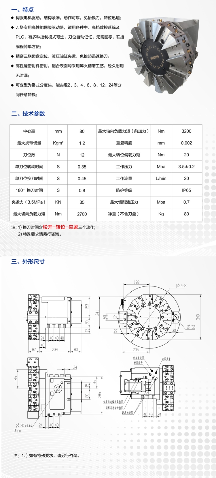伺服电机启动,结构紧凑,动作可靠,免抬换刀,转位迅速;