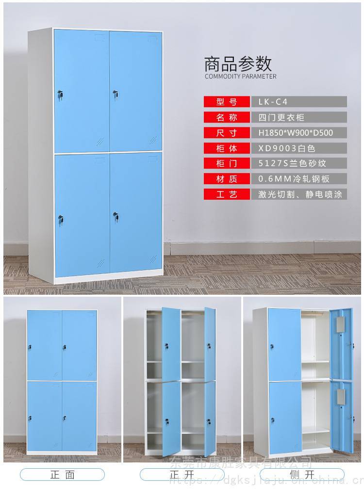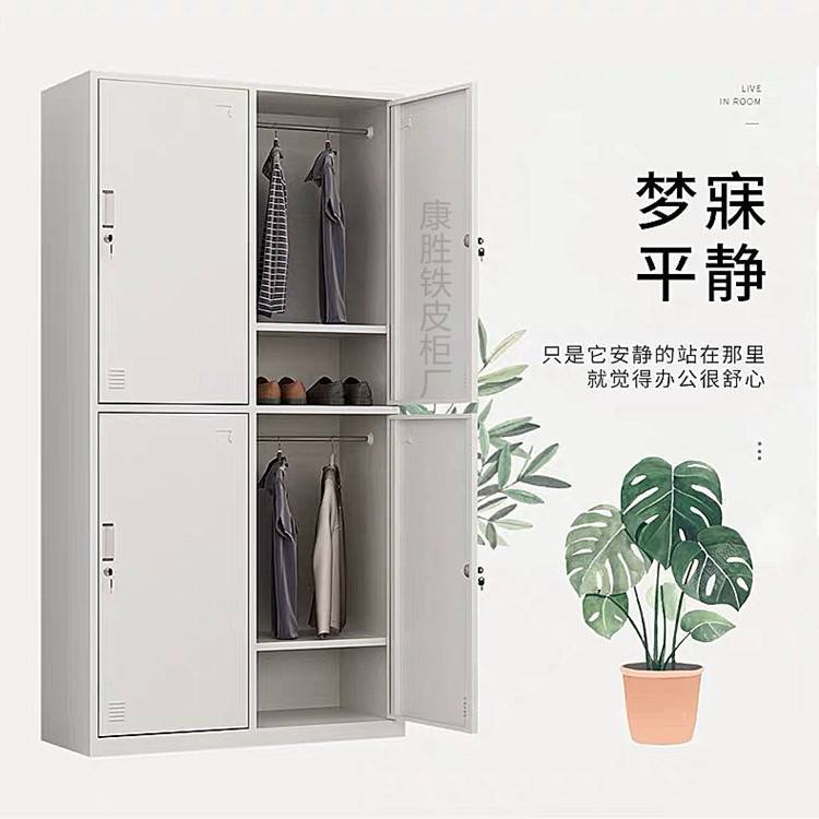 ? ?康胜时尚员工四门更衣柜,采用冷轧钢材质一体成型制作而出,外形美观大方,内部储物空间大,满足员工的储物生活。