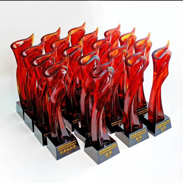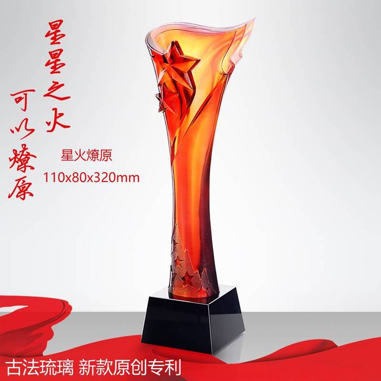 上海琉璃奖杯厂家制作红旗奖杯琉璃五角星奖杯红色火焰火炬奖杯定制彩色琉璃奖杯纪念品刻字配红色礼盒