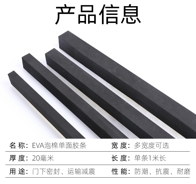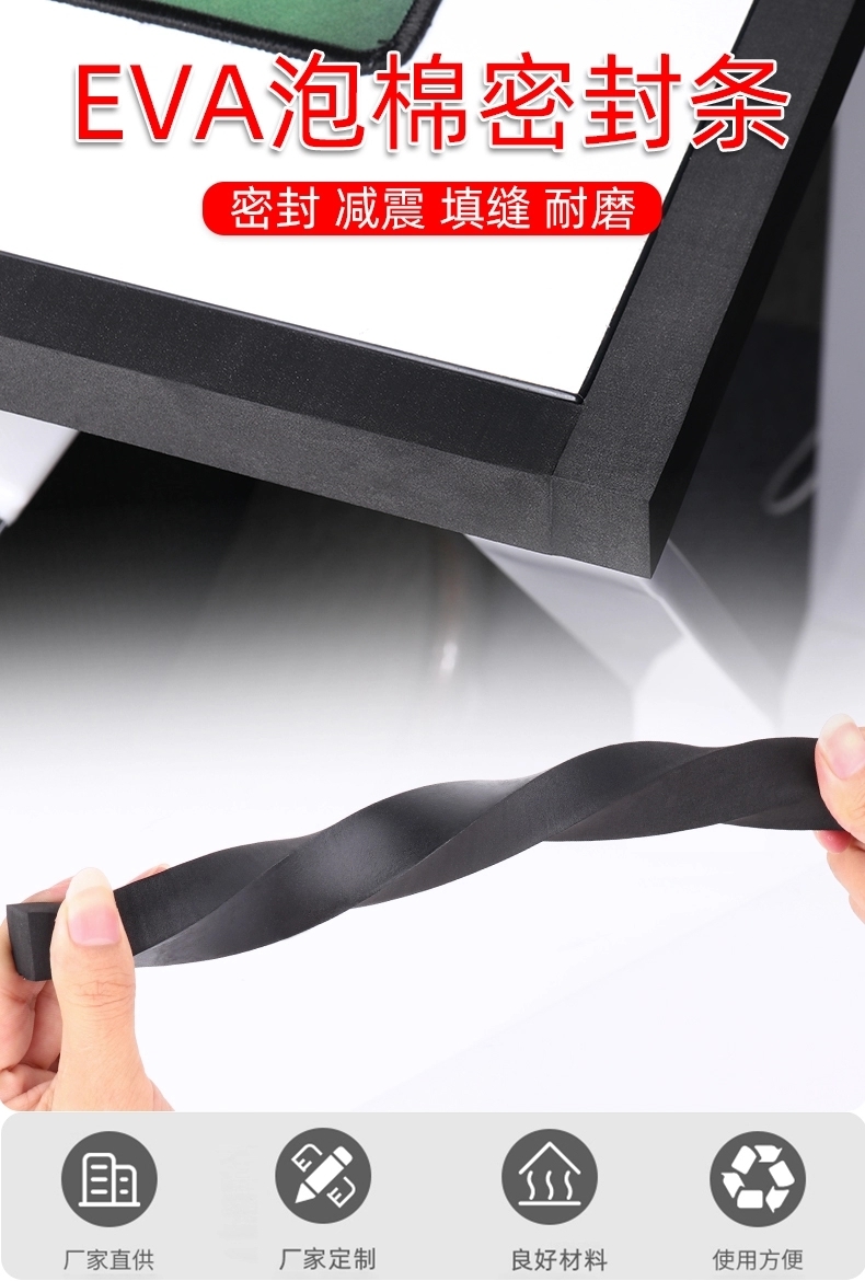 耐高温密封海绵胶条EVA橡塑制品是新型环保塑料发泡材料,它由eva塑胶原料发泡而成。克服了普通发泡胶易碎、变形、回复性差的缺点。具有良好的缓冲、抗震、隔音、保温、防潮、抗化学腐蚀、可塑性能佳、韧性强、循环再造、抗撞力.防滑且无毒、不吸水等诸多优点,亦具有很好的抗化学性能,是传统包装材料的理想替代品。且符合环保要求,是出口产品的好选择。