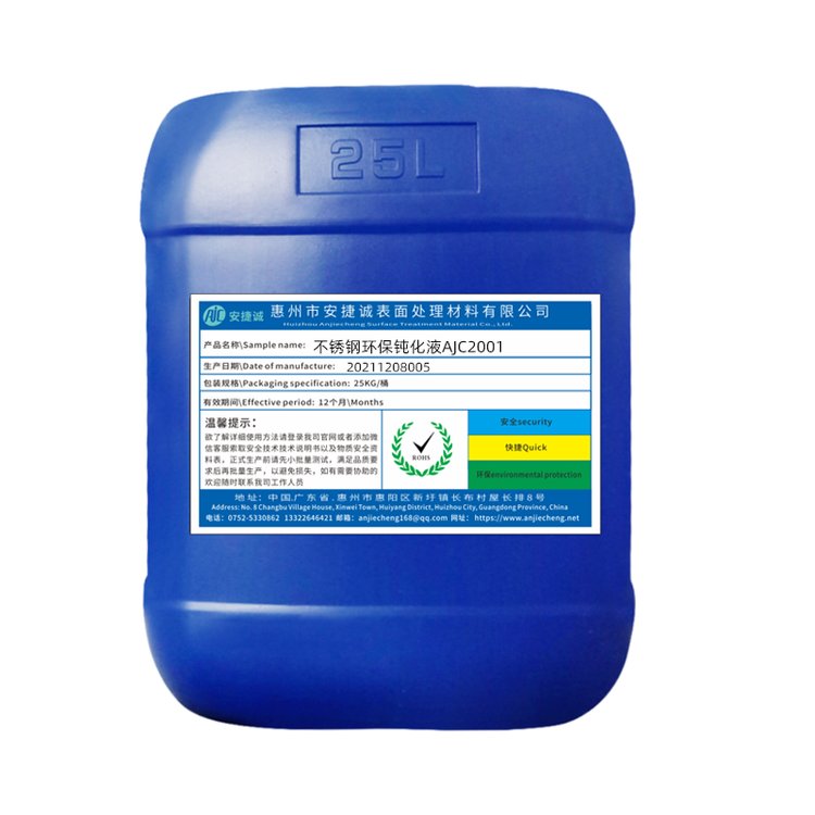安捷诚不锈钢环保钝化液(AJC-2001)适合所有SUS200和SUS300系列不锈钢材料钝化 ,材料通用性强、便于使用。可不锈钢表面形成均匀的钝化保护膜,并提高不锈钢工件抗盐雾性能。中性盐雾性能提高 10-30 倍。